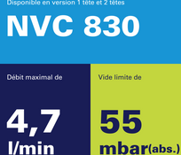 La NVC 830 KNF est disponible en version à une ou deux têtes. Selon le modèle, elle atteint un débit maximal de 4,7 l/min et un vide limite de 55 mbar (abs.). Selon le projet, la pompe peut être fabriquée avec différents matériaux pour la tête, la membrane et les clapets afin de garantir la compatibilité chimique. Les clients peuvent choisir entre une connexion électrique simple à deux fils pour un point de consigne fixe ou une connexion avancée à quatre fils pour un contrôle de point de consigne variable. Des accessoires supplémentaires, tels que des silencieux, rendent la pompe encore plus adaptable aux exigences spécifiques.